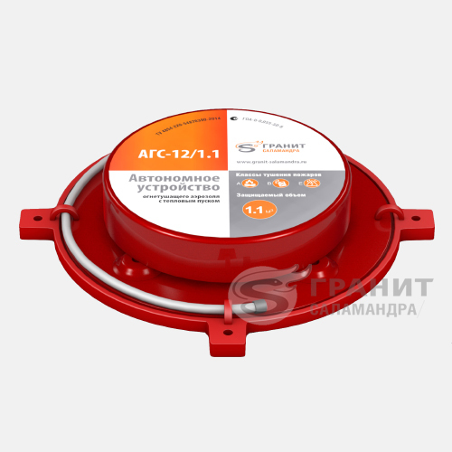 Standalone aerosol fire extinguishing unit with a thermal starter AGS 12/1,1 is a saturation extinguisher and intended to control and extinguish fires of flammable and combustible liquids, solid fuels and electrical equipment, including energized one.